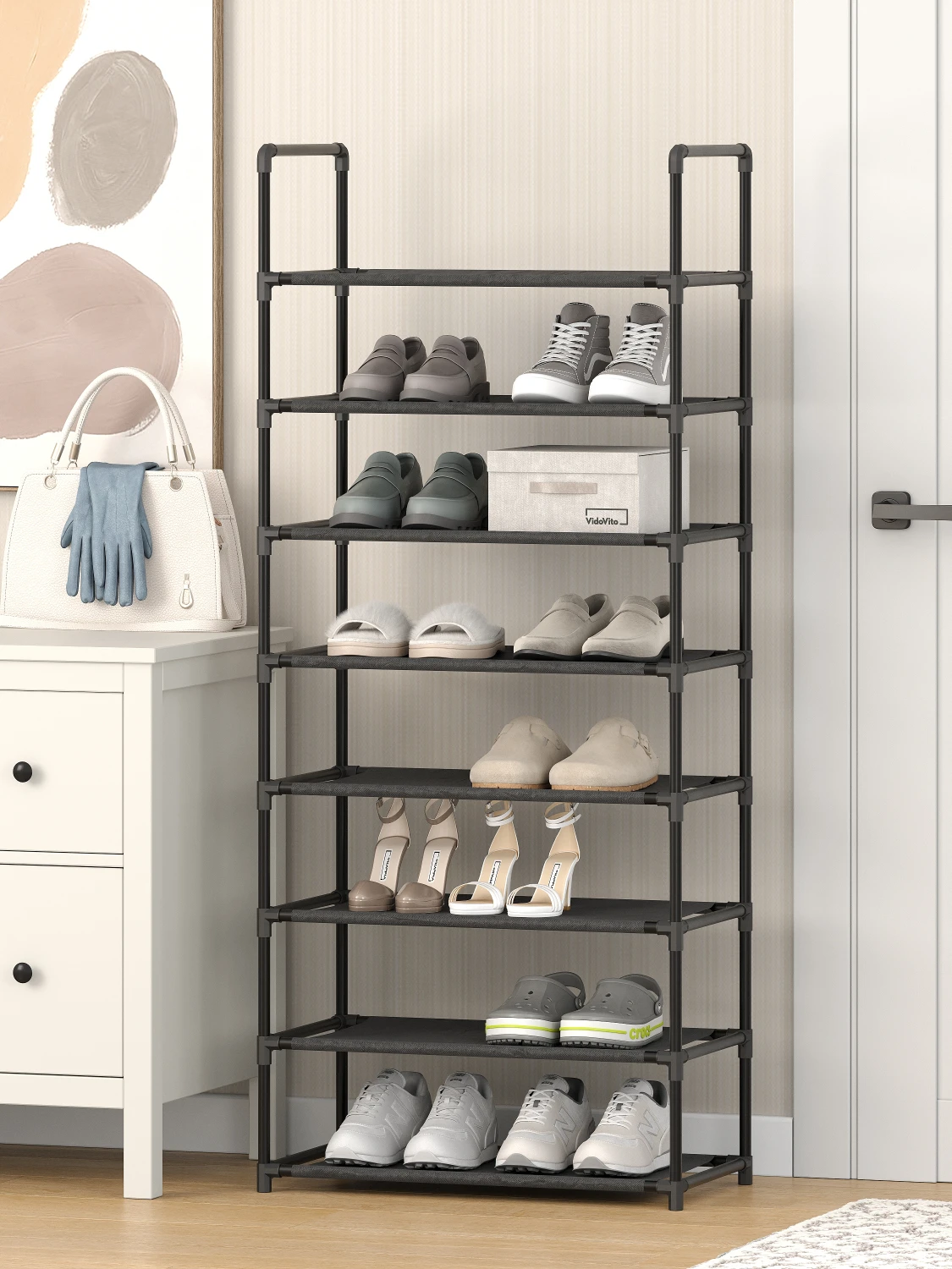 Обувница Vidovito с восемью полками. Увеличенная вместимость при сохранении узкой формы.