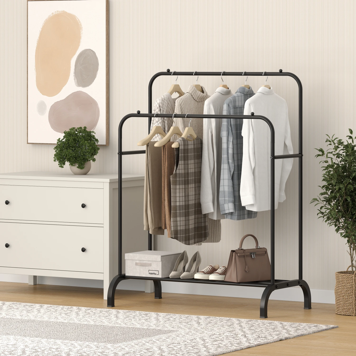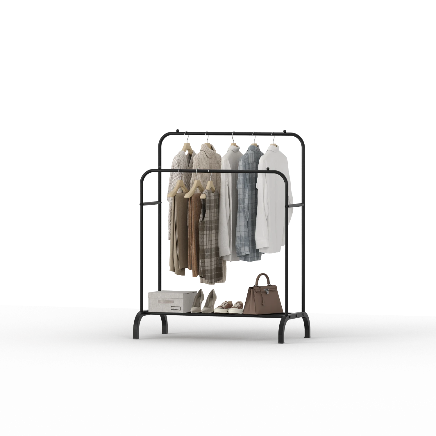 Напольная вешалка Vidovito с двумя рейлами для одежды. Удобно использовать в прихожей, спальне, гардеробной или офисе — где нужно больше места для одежды, но без громоздкого шкафа.
